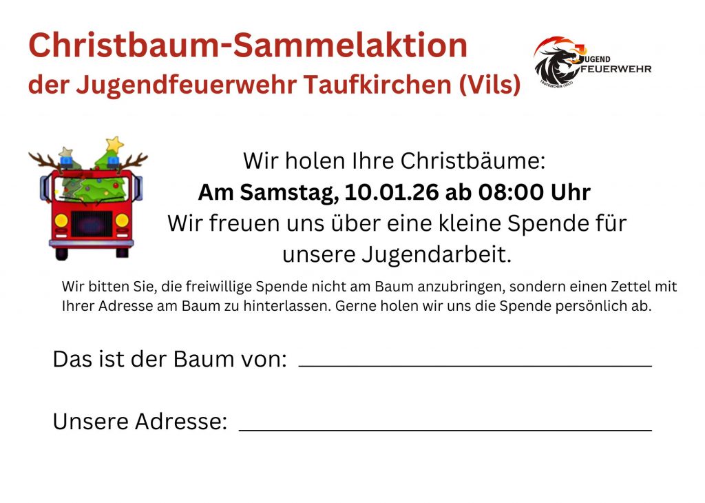 Die Jugendfeuerwehr holt die Christbäume im gesamten Ortsgebiet Taufkirchen ab (keine Außenbereiche). Bitte befreit euren Baum von jeglichem Schmuck. Nur so können wir ihn korrekt entsorgen. Die Sammelaktion startet um 08:00 Uhr. Bis dahin sollte der Baum gut sichtbar am Straßenrand platziert sein. Die Jugendfeuerwehr freut sich über eine kleine freiwillige Aufwandsentschädigung für die Entsorgung der Christbäume.